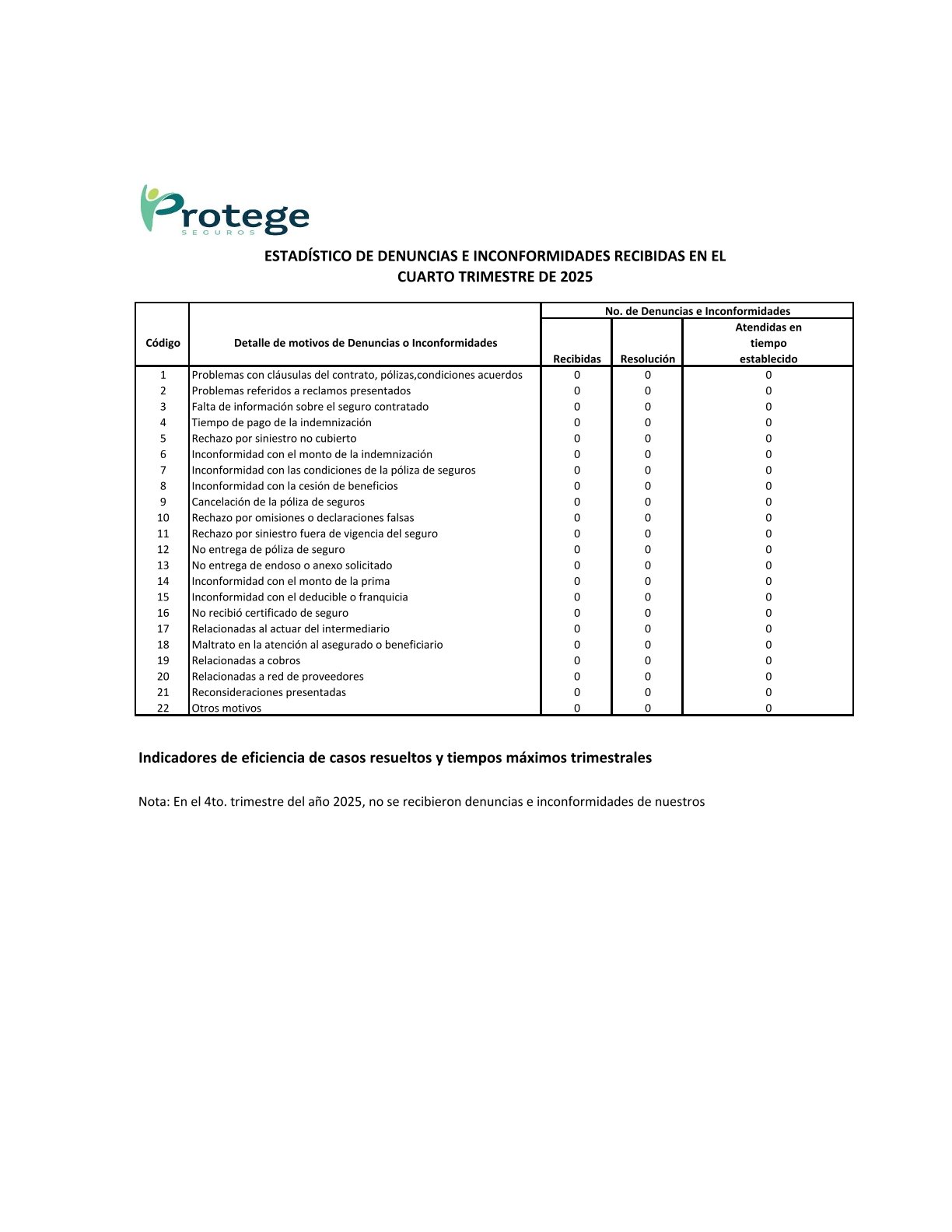 Indicadores de eficiencia de casos resueltos y tiempos máximos trimestrales